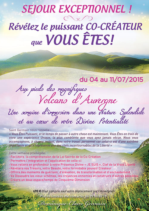 Lors du séminaire nous évoquerons les grands principes de la Loi de la Divine manifestation. Nous expliquerons comment nous nous sommes construits et comment nous continuons à attirer ce qui se produit dans nos vies. Nous étudierons comment manifester nos désirs les plus purs. Nous observerons comment nos pensées, nos émotions, nos actes et nos mémoires déterminent notre réalité et comment nous transformer. Nous explorerons notre Divinité qui est la source de notre Divin Pouvoir. Nous travaillerons sur nos Visions, car sans vision les gens périssent ! Des exercices et des méditations seront proposés. Ce stage intense a déjà aidé de nombreuses personnes !